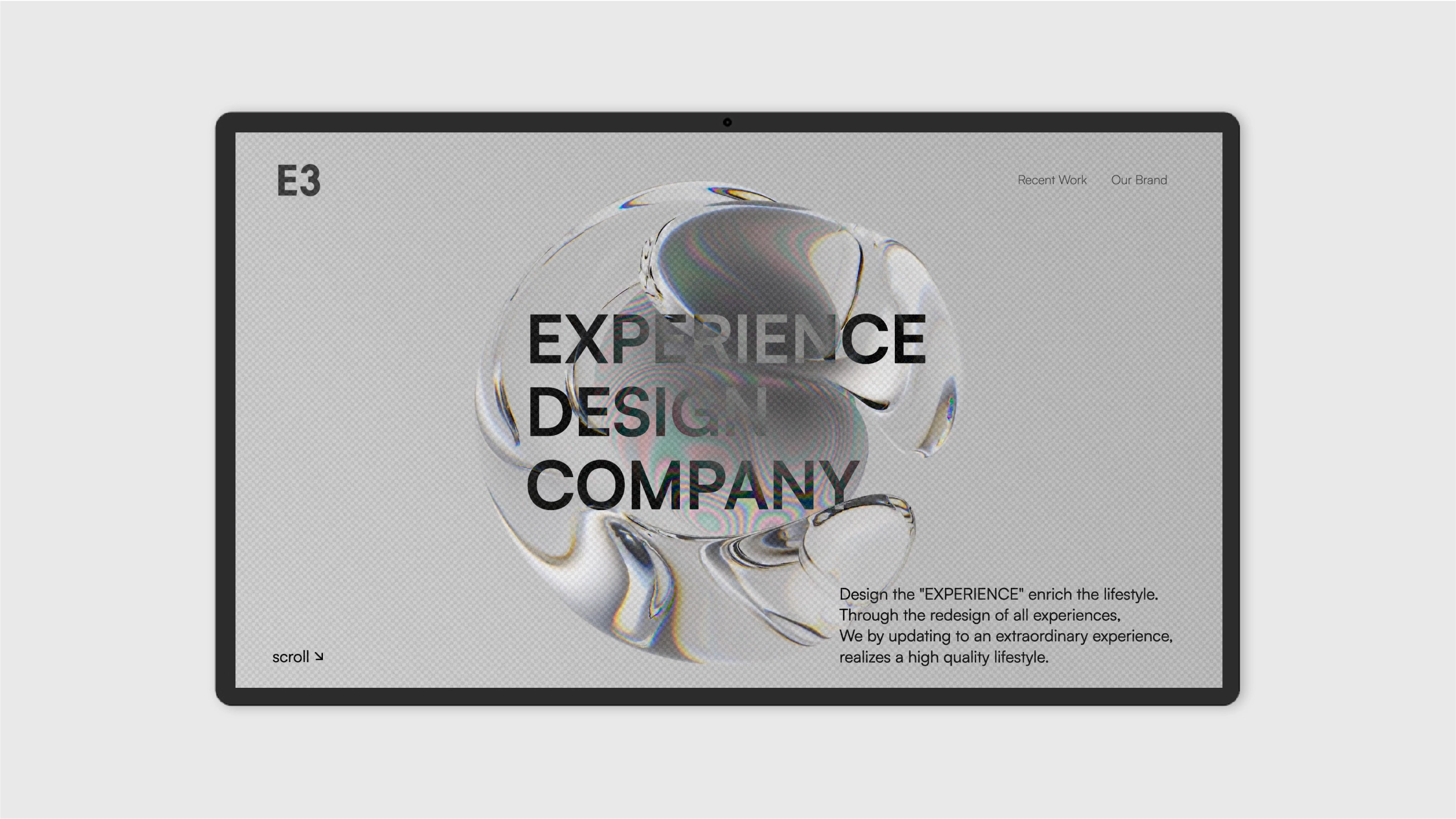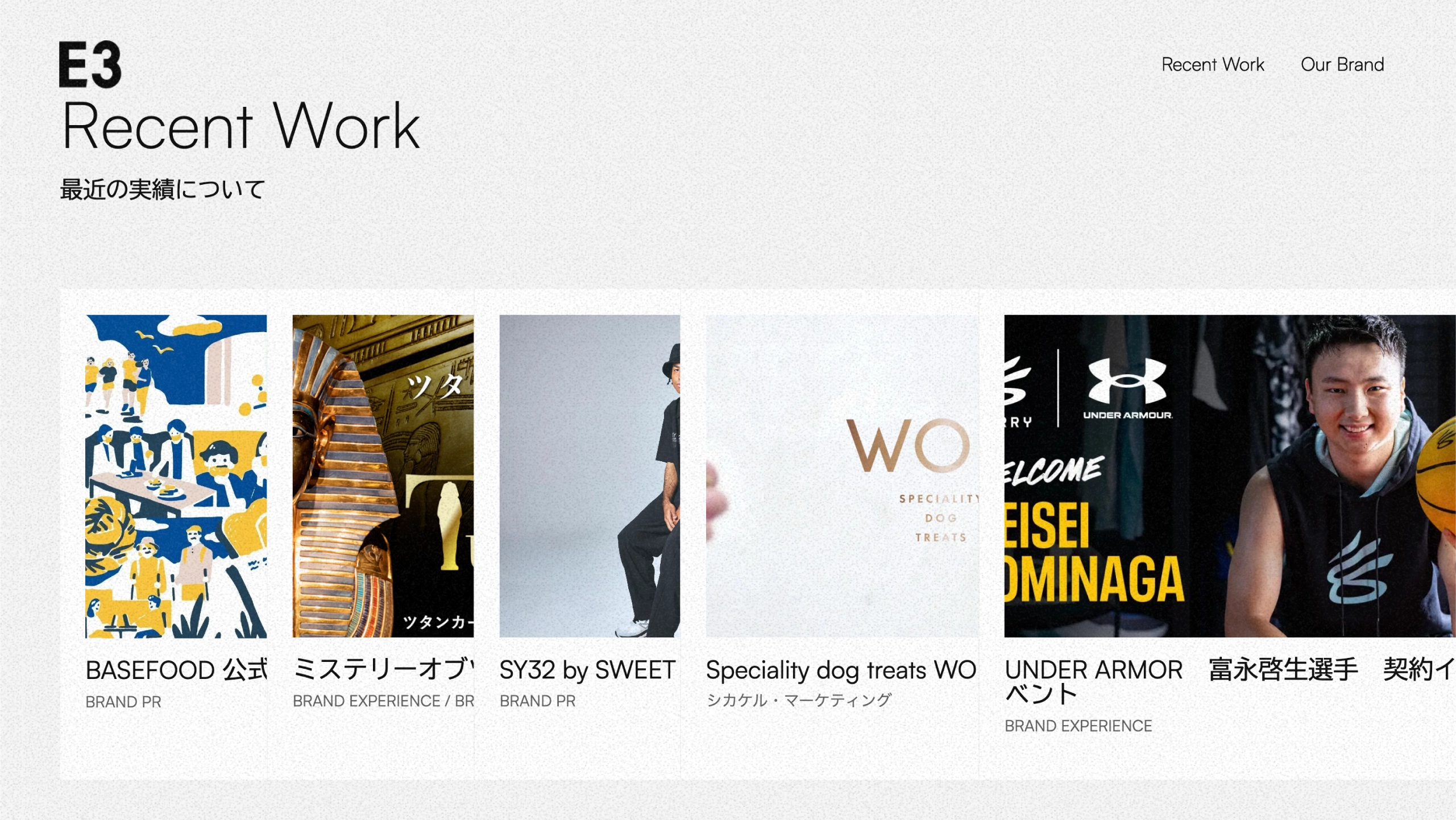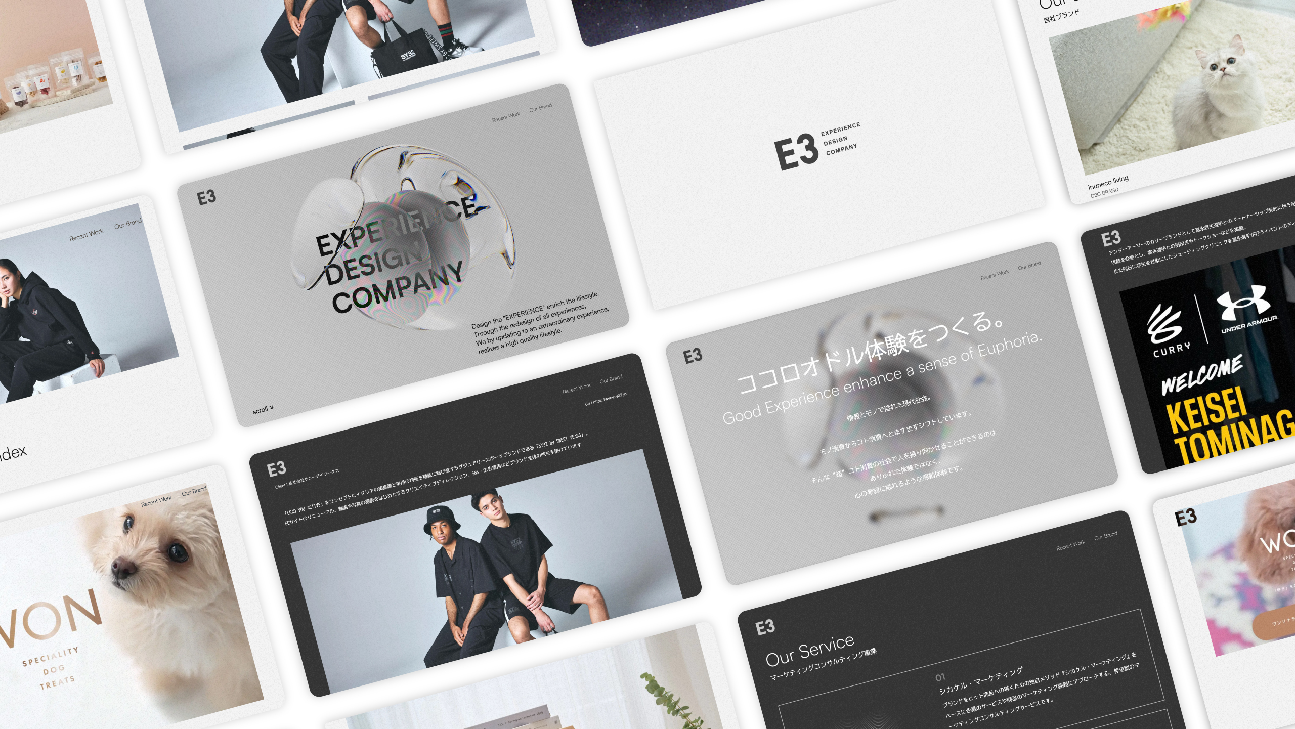 「ココロオドル体験をつくる。」をミッションにしたエクスペリエンスデザインカンパニーブランドのPRプロモーションや自社ブランドを展開している制作会社E3のコーポレートをブランディングからデザイン・マークアップまで制作